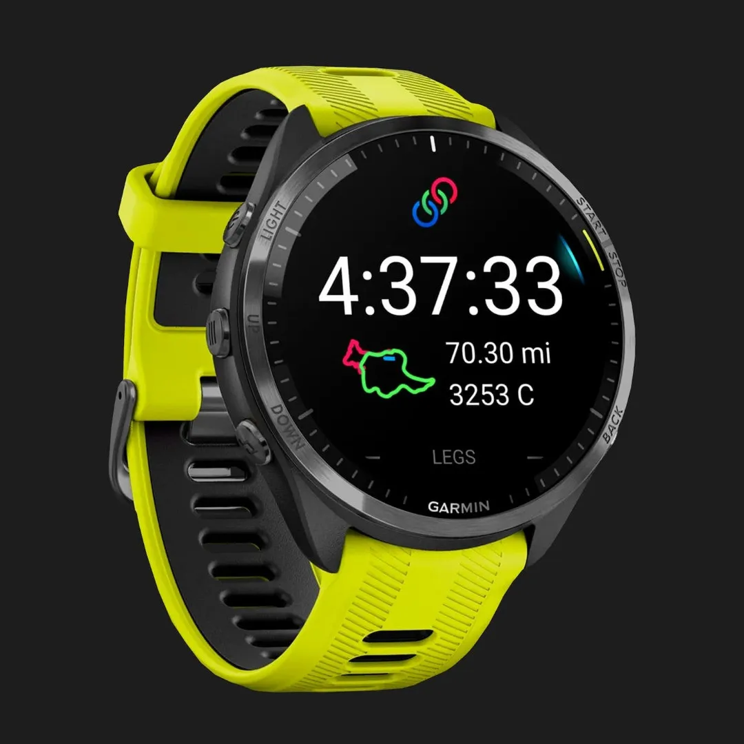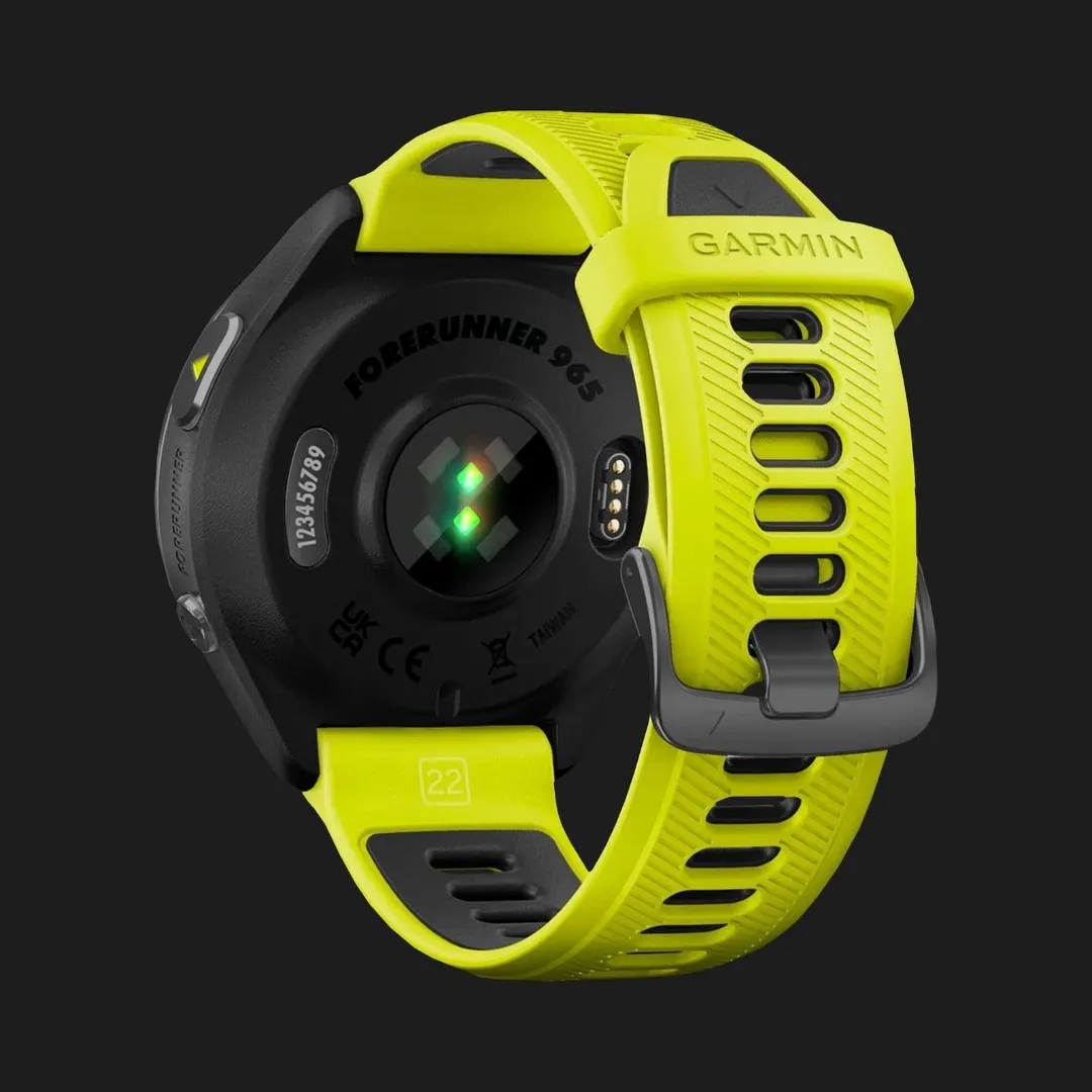 Garmin Forerunner 965 Carbon Gray DLC Titanium Bezel with Black Case and Amp Yellow/Black Silicone Band